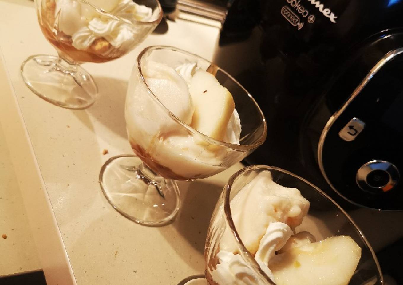 - Repartir les poires dans des verrines ou des coupes, émietter les cookies dessus, ajouter une ou deux boules de sorbet puis garnir de chantilly. Servir décoré d'une lamelle de poire au dessus.